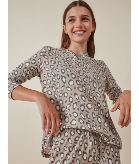 - Pijama de invierno, con camiseta de punto estampada de Animal print, detalle de encaje en escote.